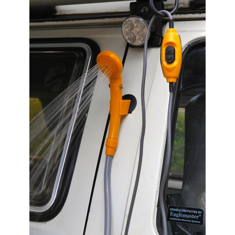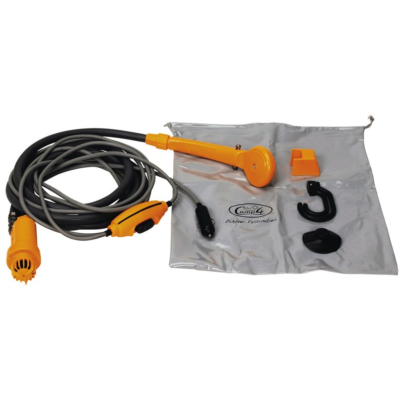Za priklop na vžigalnik preko 5 m priključnega kabla. S stikalom za vklop/izklop. Pritrditev na zunanjo steno vozila s priseskom. Vgrajena 12 V črpalka in 2 m priključna cev za prho. Vključno s PVC transportno vrečo.