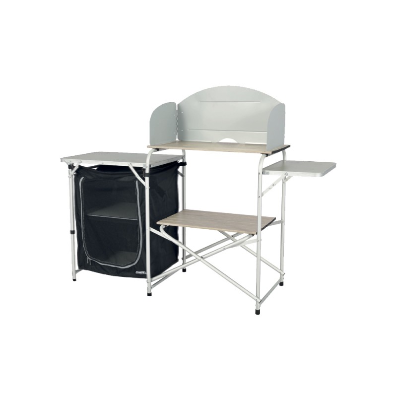 Kompaktna kuhinjska omarica za kampiranje ponuja praktično rešitev za pripravo obrokov na prostem. Stojalo za kuhalnik s toplotno zaščito zagotavlja varno kuhanje, medtem ko dva prostorna predelka za posodo omogočata organizirano shranjevanje kuhinjskih pripomočkov. Dve stranski polici nudita dodaten delovni prostor, idealen za pripravo hrane. Zahvaljujoč zložljivi zasnovi in vključeni torbi za prenašanje je enostavna za transport in shranjevanje.
