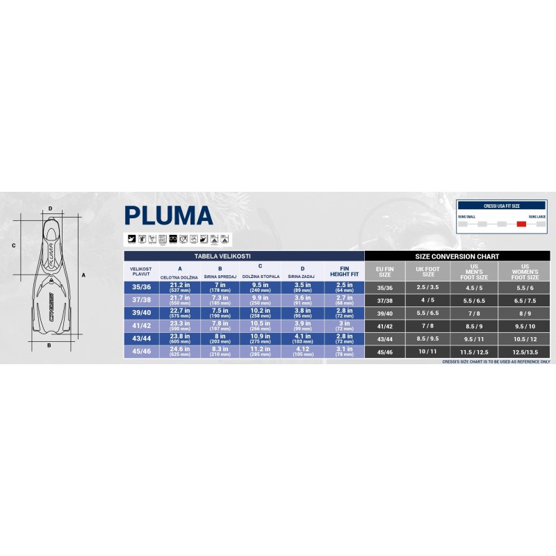 Pluma je izjemna plavut, ki najbolj izkorišča prefinjeno tehnologijo oblikovanja, ki se je prej uporabljala le pri visokotehnoloških modelih, ki so posebej zasnovani za prosto potapljanje in potapljanje. Pravzaprav uporablja isti Cressi patentiran konstrukcijski sistem oblikovanja v 3 različnih materialih, da doseže visoko zmogljivost, izjemno lahkotnost in enostavno brcanje ter presenetljivo udobje. Rezilo je narejeno iz lahkega in hkrati reaktivnega polipropilena, z zelo energičnim in hitrim odbojem. Dva bočna podporna utora in druga rebra na dnu rezila zagotavljajo postopno in nadzorovano upogibanje. Rezultat je močan in tekoč, neumorno brcanje, tako kot bi moralo biti zagotovljeno plavuti v tej kategoriji. Ohišje stopal se razteza desno vzdolž dna rezila, kar zagotavlja visoko zaščito med brcanjem tudi v plitki vodi in blizu skal in podobnega. Narejena je iz mehke termo-gume in računalniško oblikovana oblika nudi veliko udobja in tudi njihovo primerno uporabo za dolgotrajno uporabo. Celoten podplat je trden in je opremljen z velikimi nedrsečimi vložki, tako za popolno zaščito stopala kot tudi za odličen prenos napora za nogo. Popolnoma nova tehnologija gradnje futurističnih vrtljivih, dvojno brizganih kalupov pomeni, da je mogoče istočasno oblikovati dva različna materiala, s čimer se proizvodni stroški ohranijo na najnižji možni ravni, kar pomeni, da je razmerje med ceno in kakovostjo neverjetno