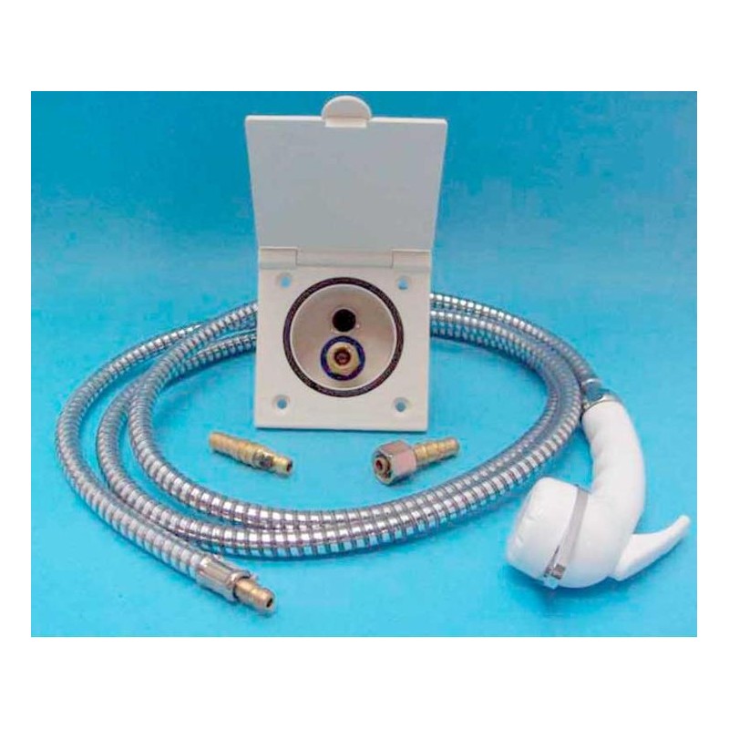 Bela vodna ''vtičnica'' proizvajalca Reich s hitro spojko za neposredno priključitev tuš cevi, s stikalom in vključno s spojnimi deli. Premer spojke 62 mm, globina 55 mm.