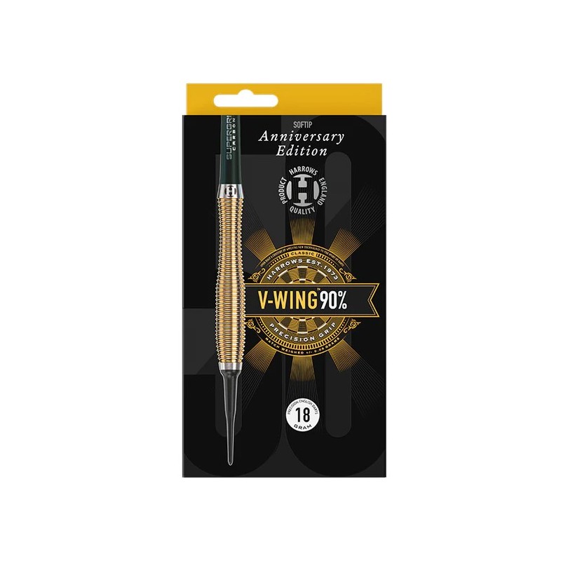 Zaradi svoje edinstvene sodčaste oblike so puščice V-Wing takoj postale priljubljene, ko so bile izdane leta 2004. Puščica ima natančen obročast oprijem in klasičen ukrivljen 'V-Wing' profil cevi. Ta edinstvena kombinacija je ustvarila nenavaden sod, ki ga imajo radi mnogi. Te puščice so opremljene z midi Supergrip Carbon in novimi peresi Harrows Anniversary 100 mikronov.