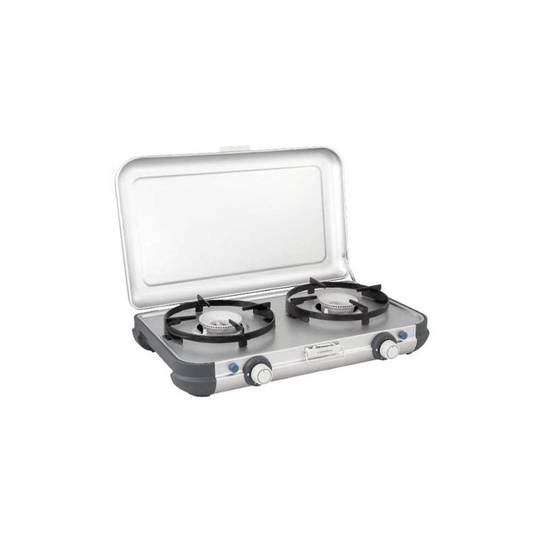 Lahka in enostavna kamp peč z dvema gorilnikoma, ki je na voljo tako s kartušo kot s plinsko steklenico, odvisno od dolžine dopusta. Kompaktna oblika z vgrajenimi ročaji omogoča prihranek prostora v avtomobilu ali avtodomu. Držala za posode je enostavno odstraniti za hitro in enostavno čiščenje.
