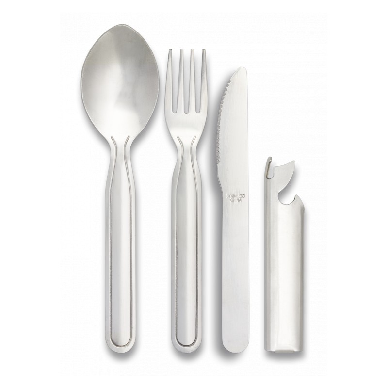 Kompakten in lahek set jedilnega pribora, zasnovan posebej za kampiranje, pohodništvo, ribolov, izlete ali vojaško rabo. Komplet vsebuje vse nujno: nož, vilico, žlico in odpirač, ki so zloženi v praktičen, večfunkcijski pripomoček. Izdelan iz trpežnih materialov, enostaven za prenašanje in čiščenje.