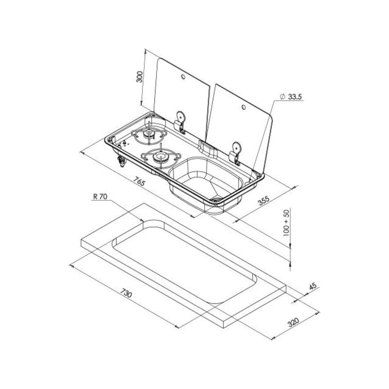 2-plamenska kombinacija štedilnik-pomivalno korito 1x1000 W (A) in 1x1700 W (SR) z 2-delnim steklenim pokrovom in piezo vžigom.