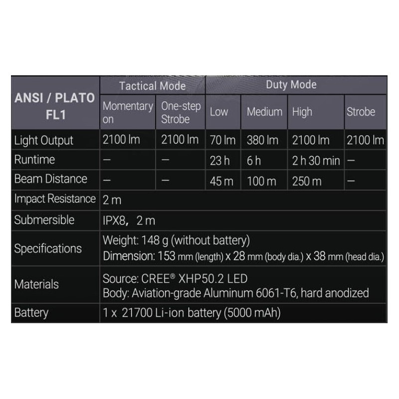 TA30 Max je kompaktna in vsestranska taktična svetilka z maksimalno zmogljivostjo 2100 lumnov in dometom do 250m. Patentirano dvofunkcijsko taktično stikalo lahko dostopa do trenutnega vklopnega ali enostopenjskega stroba v vseh delovnih pogojih, tako da polovično ali v celoti pritisnete stikalo. Z vrtenjem rotacijskega magnetnega stikala okrog pokrovčka spreminjamo svetilne možnosti. TA30 Max svetilko odlikuje izjemno visoko trdni Nano-keramični okvir, ki učinkovito omogoča tudi razbitje avtomobilskega stekla.