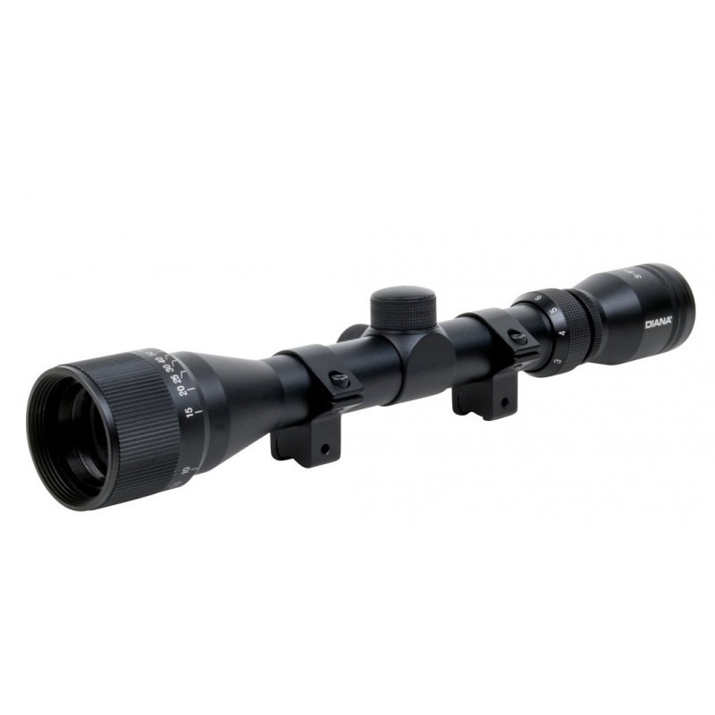 Strelni daljnogled nemške znamke Diana za zračno puško ima variabilno povečavo 3-9 ter nastavljivo paralakso na objektivu.