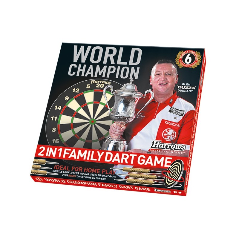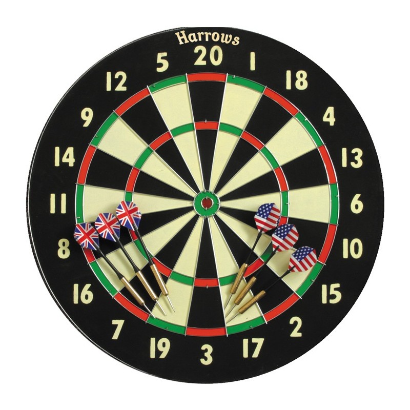 Tarča iz plute za celo družino. Vlkjučuje dve igri in 6 kovinskih pikado puščic 18g.